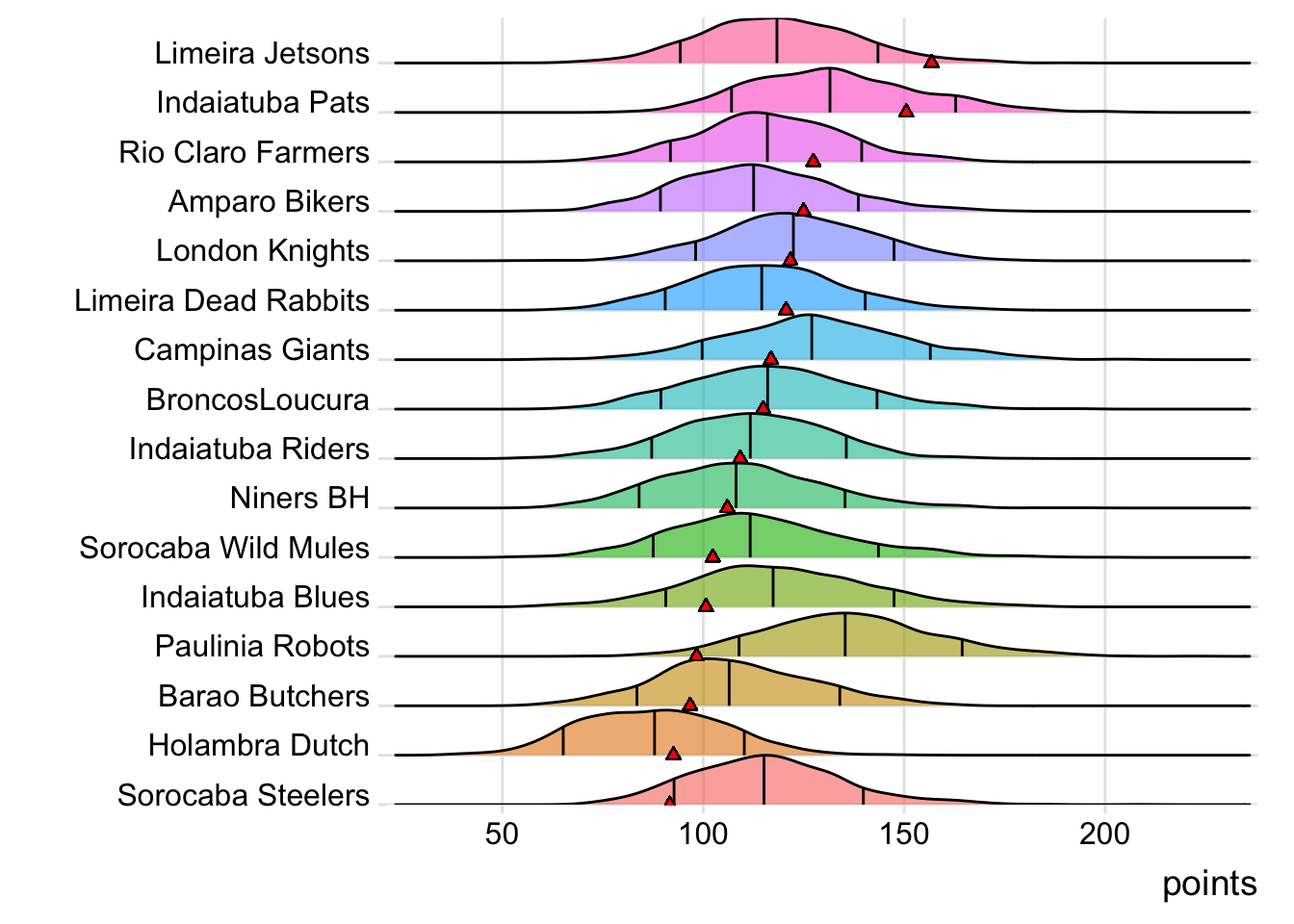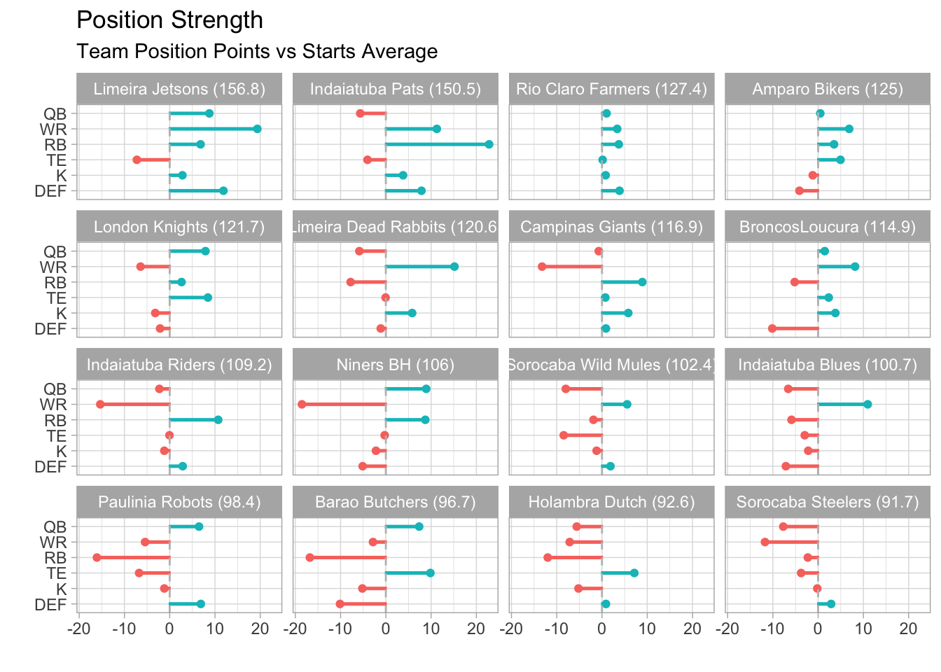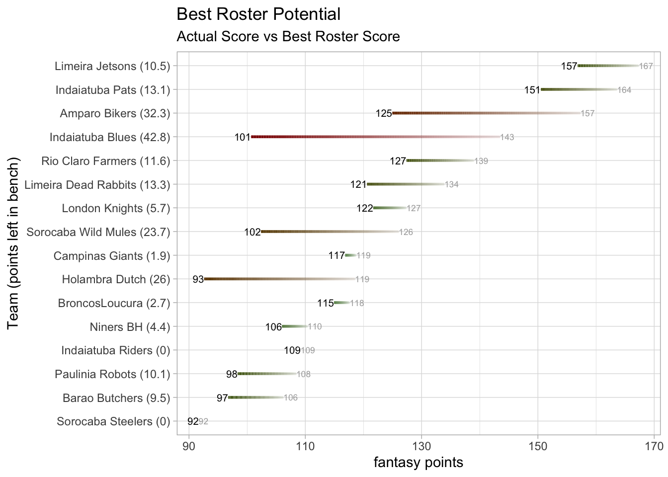 Indaiatuba Pats was projected to win by the widest margin in the league this week (54.29 points) and they topped it with a 57.92-point victory.
