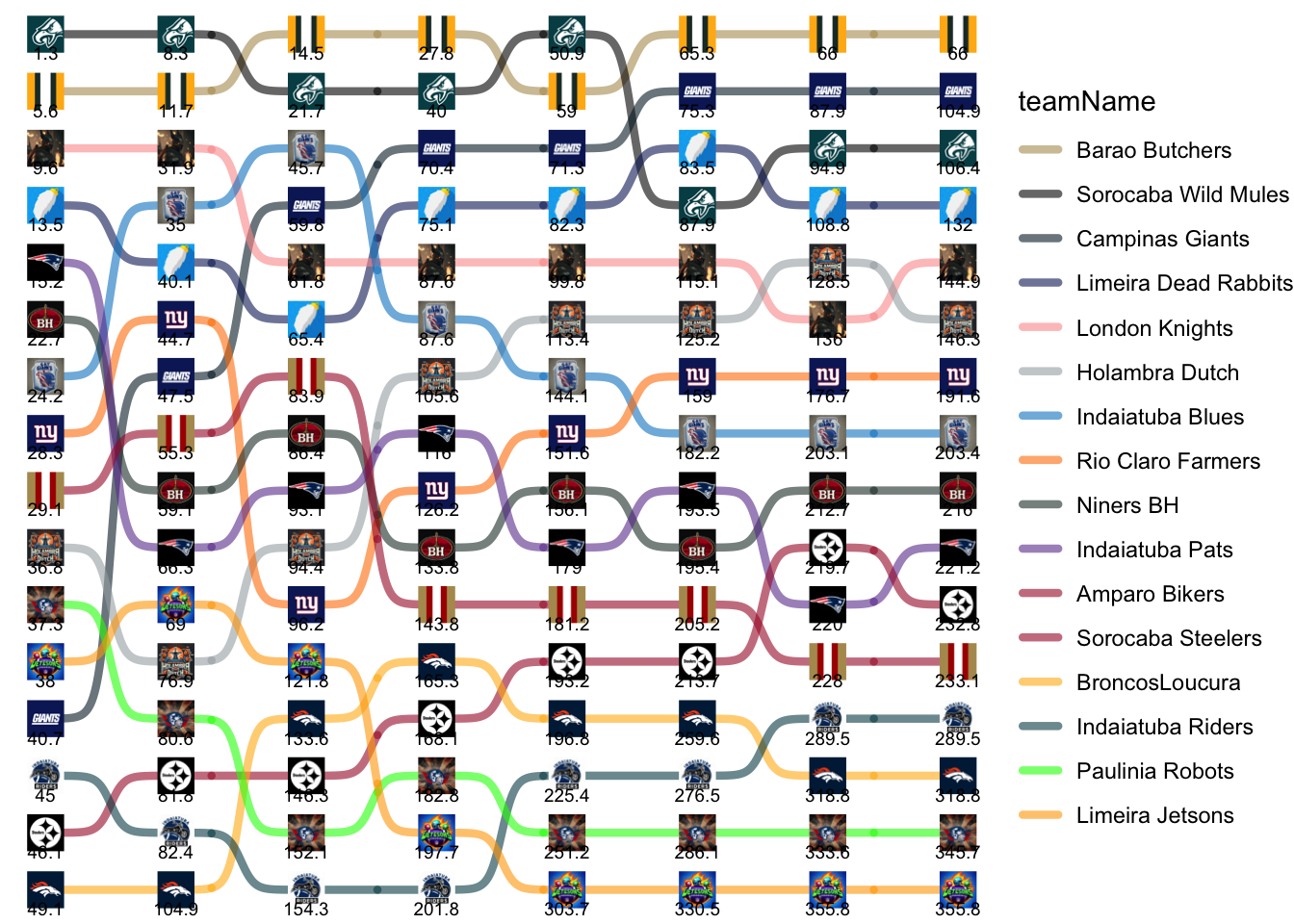 | Indaiatuba Riders | 45.02 | 37.40 | 71.86 | 47.48 | 23.60 | 51.10 | 13.00 | 0.00 |