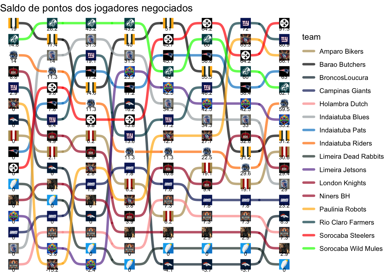 Total de pontos que foram deixados de ganhar na melhor escalação possível, acumulado ao longo das rodadas.