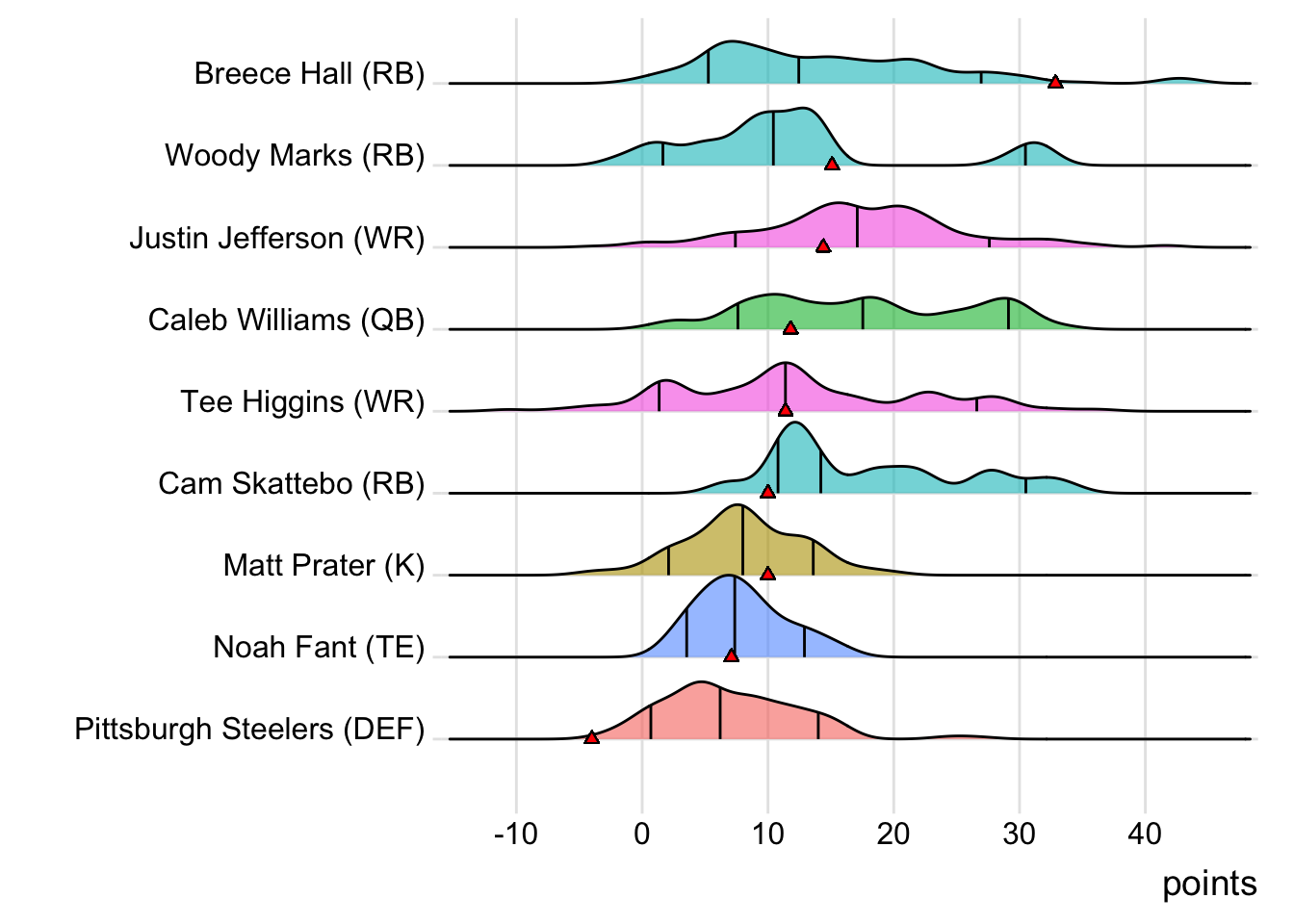 Since Franklin was the leading point-getter for Limeira Jetsons, it means a different player has now topped the team in each of the past five weeks. With 36.00 points, Puka Nacua paced the squad in Week 4, while Kyren Williams put up 31.10 points to lead the way in Week 5. Tetairoa McMillan (17.90 points) was tops in Week 6 and Trevor Lawrence (17.64 points) led last week.
