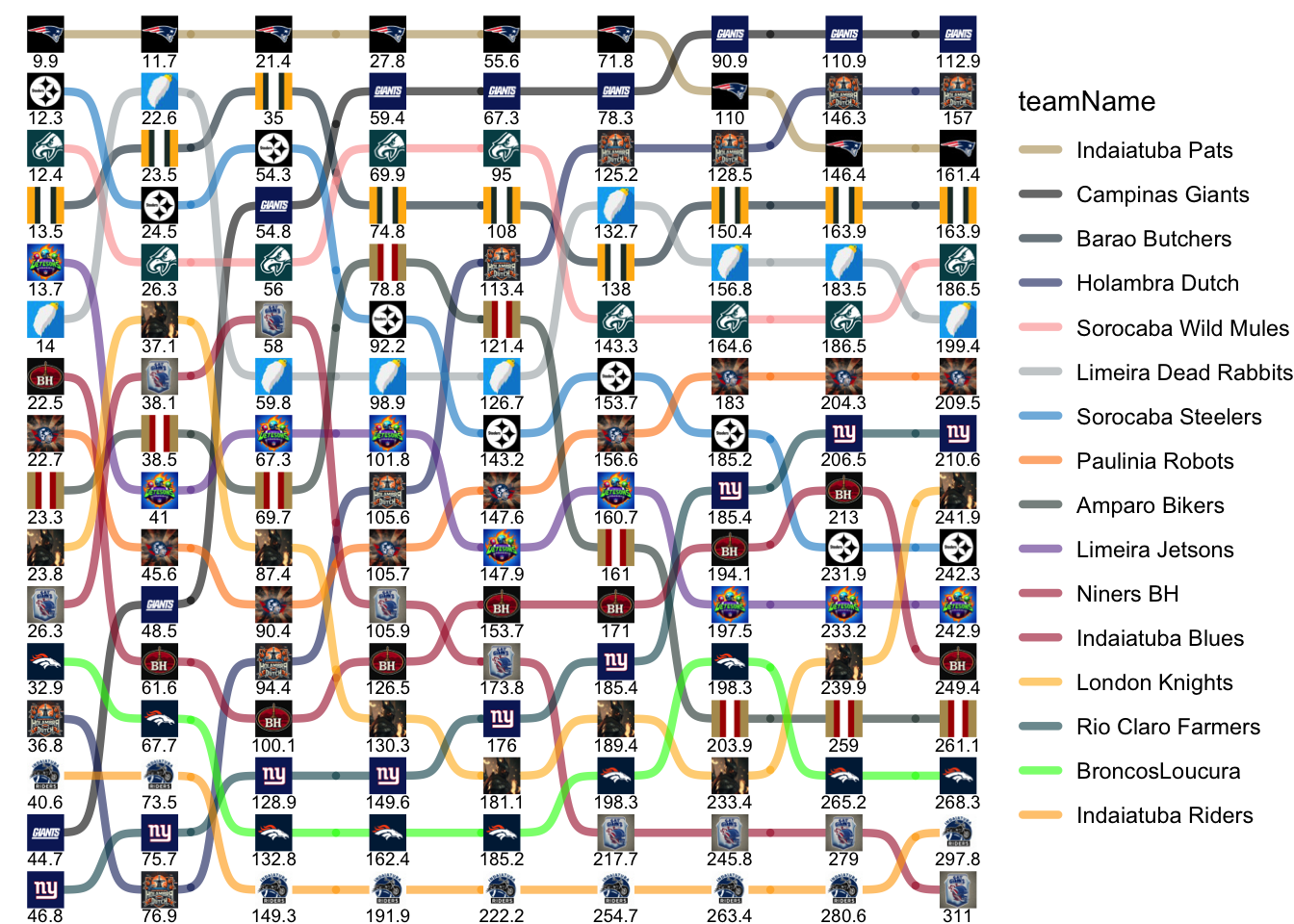 | Limeira Dead Rabbits | 14.00 | 8.60 | 37.16 | 39.10 | 27.80 | 6.00 | 24.10 | 26.70 | 15.90 |