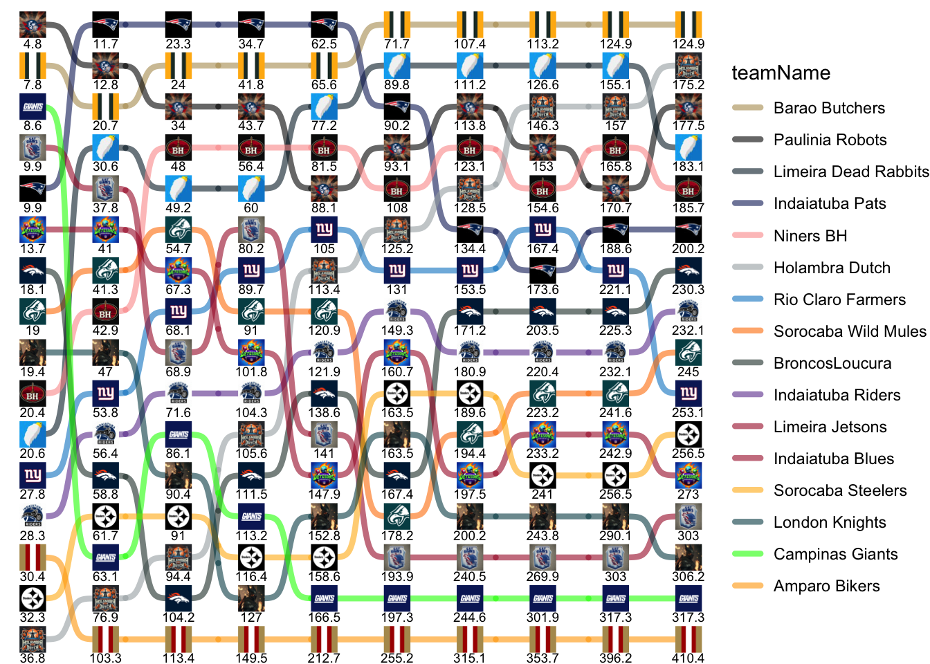 | Sorocaba Steelers | 32.26 | 29.40 | 29.30 | 25.46 | 42.22 | 4.90 | 26.04 | 51.46 | 15.50 | 0.00 |