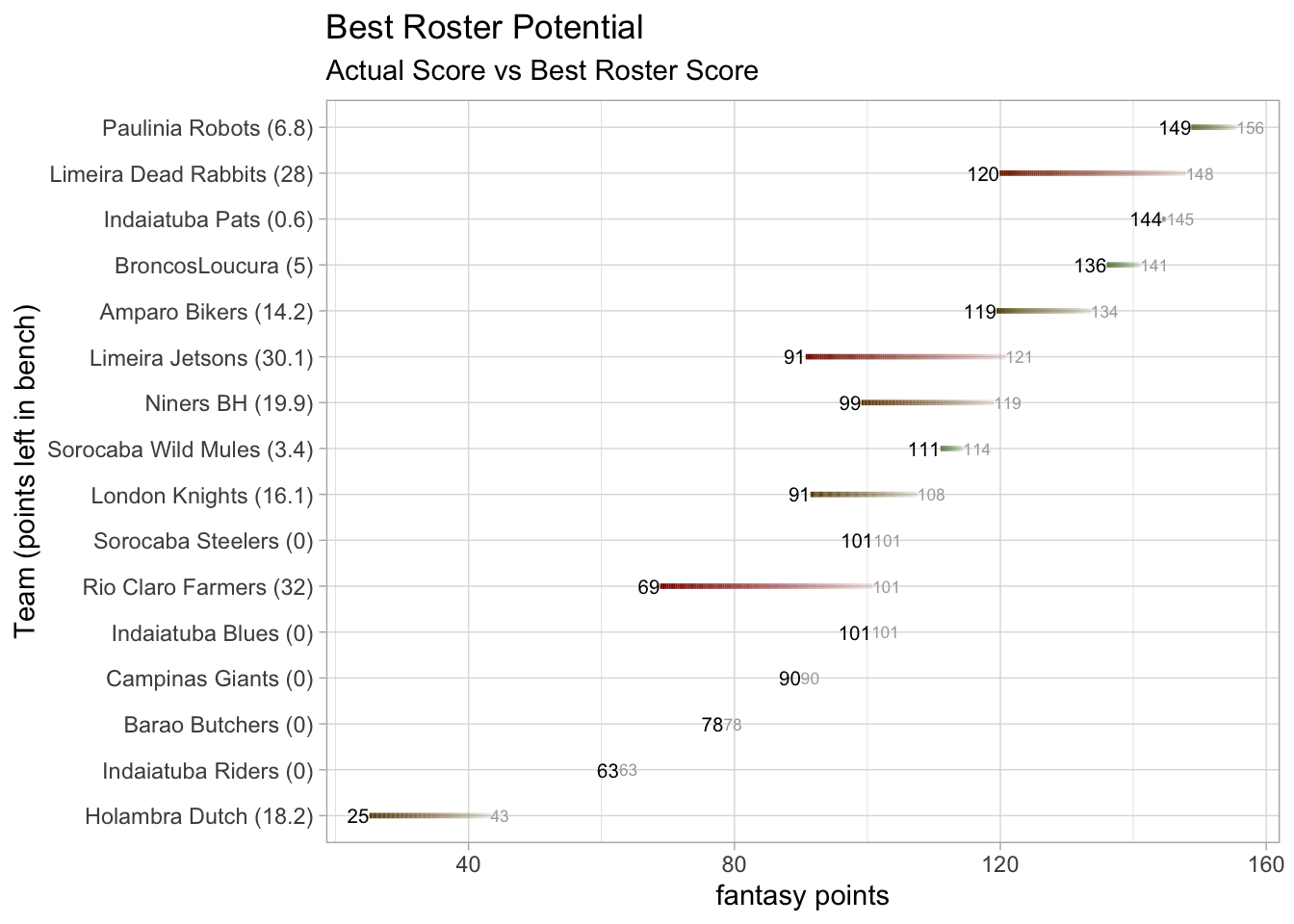 Paulinia Robots demolished Campinas Giants 148.74 to 90.02 while putting up the highest point total in the league this week. With the win, Paulinia Robots secures a spot in the playoffs. Paulinia Robots is having an incredible season and remains undefeated. Paulinia Robots (10-0, 1,295.34 points) remains in first place and Campinas Giants (8-2, 1,145.08 points) stays in third place.