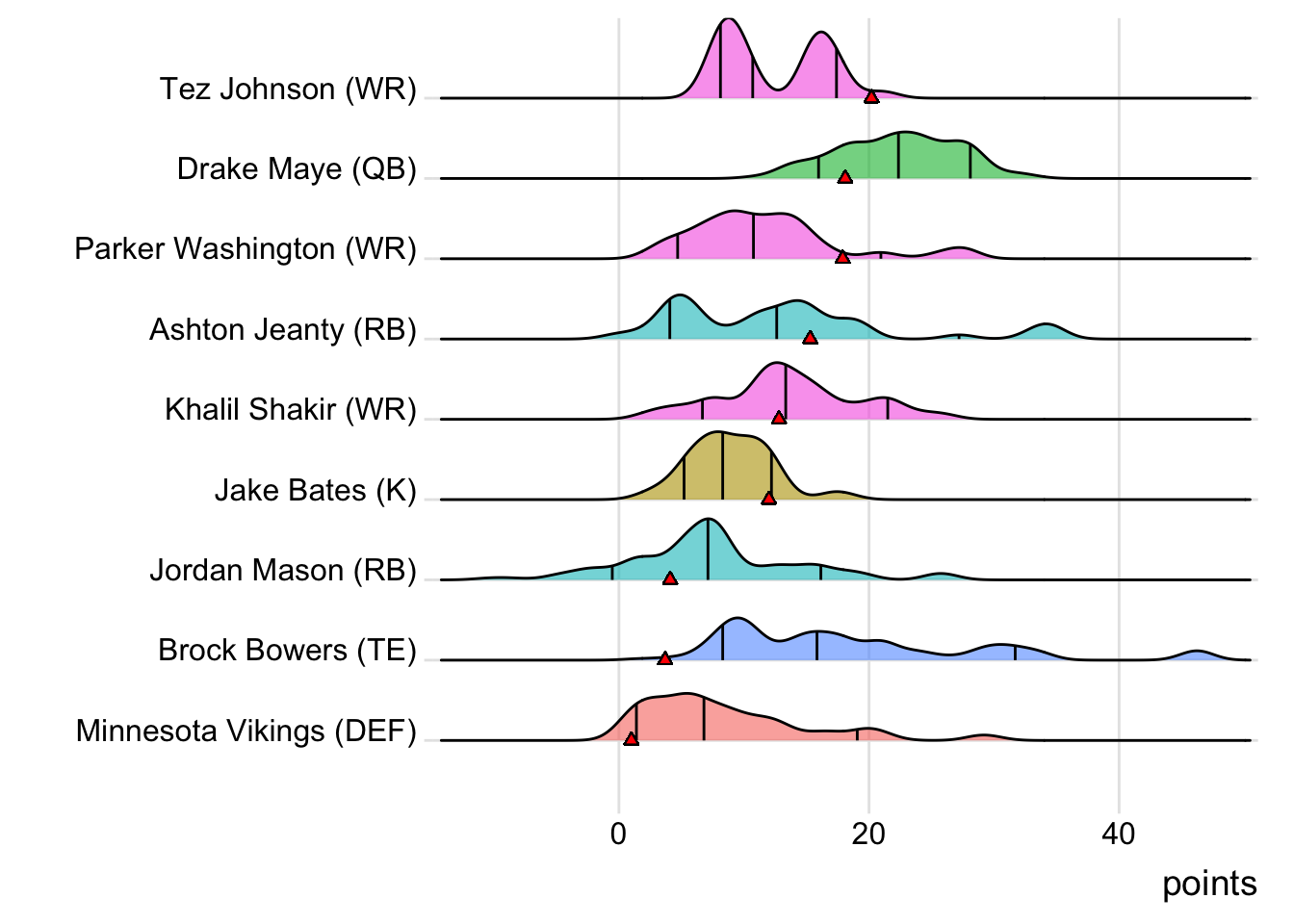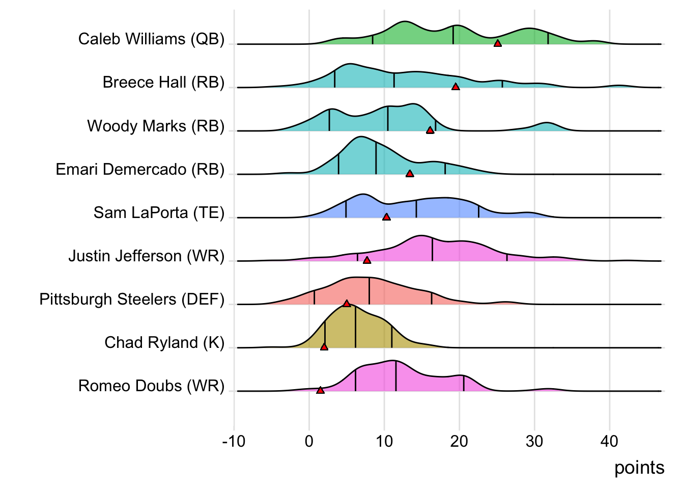 Since Williams was the leading point-getter for Limeira Jetsons, it means a different player has now topped the team in each of the past five weeks. With 17.90 points, Tetairoa McMillan paced the squad in Week 6, while Trevor Lawrence put up 17.64 points to lead the way in Week 7. Troy Franklin (26.90 points) was tops in Week 8 and Puka Nacua (22.80 points) led in Week 9.