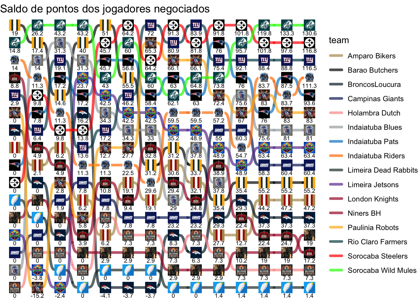 | Sorocaba Steelers | 0.0 | 9.80 | 0.00 | 4.00 | 31.94 | 18.46 | 0.00 | 27.06 | -9.50 | 10.00 | 10.00 | 0.00 | -4.20 | 19.20 |